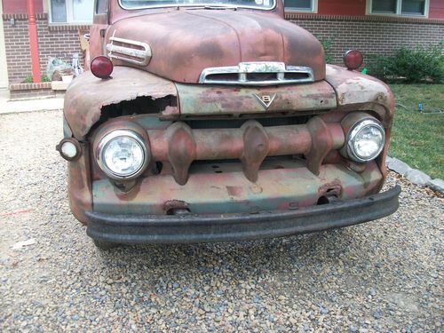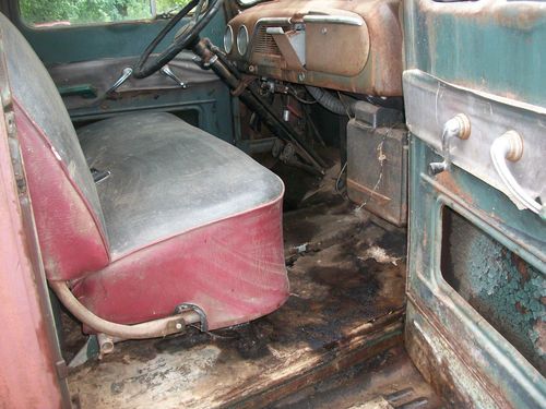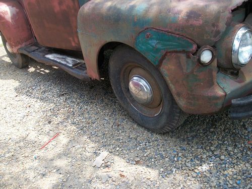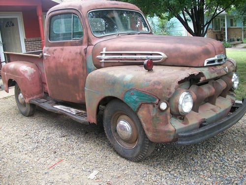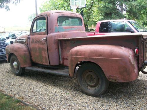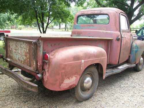this is a original 1951 f1 ford pickup with a flathead v-8 motor an 3 speed manual tranny on the colum,motor is free an will probally run with a new battery etc,has rust in the front fenders an running boards an tranny cover ,an other places etc,took pictures to show ,does roll,has no brakes,glass is good,has a nice seat,needs new wood in bed,HAS NO TITLE ,BILL OF SALE ONLY,,,,,,,,this is a cool old truck just do not have time to do it like i want,what ya see is what ya get sold as is,bill of sale only,great to restore or parts,sold to U.S ONLY, MUST BE PAID IN 3 DAYS CASHIER CHECK,30 DAYS TO HAVE PICKED UP