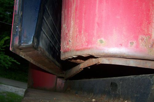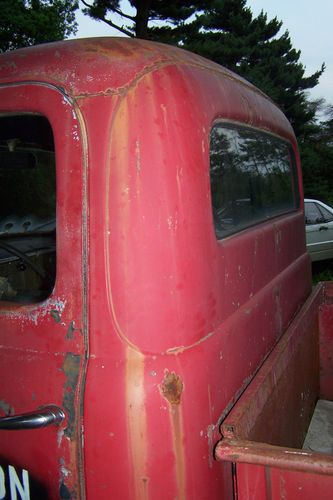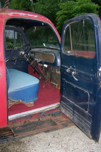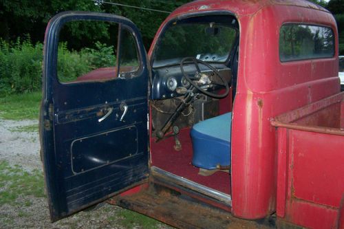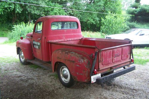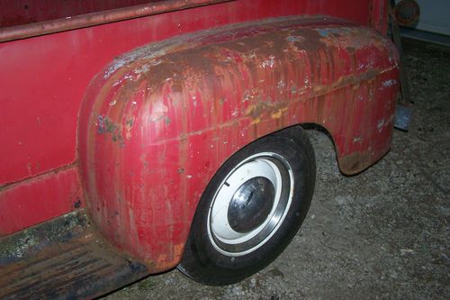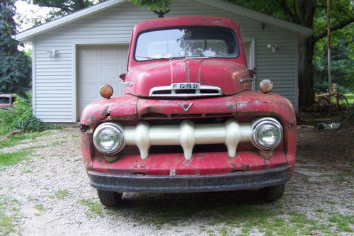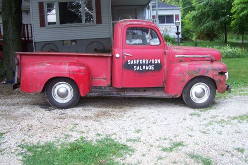 1951 Ford F-1 Pickup Truck. This truck is actually a Barn Find from Virginia. I was told that it sat in a farmer's barn for over 30 years. A couple of years ago the farmer took it out of the barn and it sat outside. I do not know how long it was outside. I got it home and changed the Spark Plugs, Points, and replaced the Fuel Pump and she ran. I replaced almost the entire Brake System including Master Cylinder, Wheel Cylinders, Lines and Hoses and now it stops! I also replaced the Wheels and Tires with period correct Baby Moons and Bias-Plys. The Truck is Red, but appears to have been Blue, from the factory. The Red Paint is old and faded and gives the truck a vintage shop-worn look. It looks so much like the old Sanford and Son truck that I painted Sanford and Son on the doors and entered it my local car show. The reaction was amazing! There were people lining up to get their picture taken beside this old truck. It amazes me how much attention this old truck gets! Since the show, I have been driving it around. It is a pretty good cruiser for short distances. I have not ventured more than about five miles from home. The Body is pretty solid, but there is some rust. I tried to show it all in the pictures. The Frame is solid. The Interior is Blue, but the seat is in good condition, so I didn't want to do anything about the color. Most of the Glass is good, but the Passenger Side Window is cracked. I will try to answer any questions through email. If you would like to come see the truck, drop me a line and we can schedule. I am listing this with no reserve and will sell it to the highest bidder. I may be able to assist with delivery, for a charge, within a couple of hundred miles of Akron, Ohio.