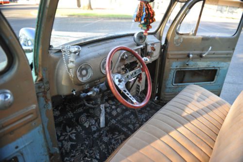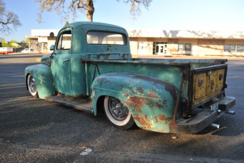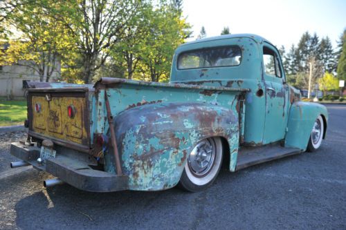 1951 Ford Custom. Chevrolet 283 with 4bbl carb. Camaro z-28 front clip installed with power steering and power brakes. chev truck 12 bolt rearend on leaf springs. this is a true rat rod with real patina. not faked patina. runs and drives really nice. it has bias ply white wall tires, so it has a little bit of the "bias ply shuffle" when driving (wanders a little. Needs to have the door glass replaced, they roll up and down but are cracked as well as the vent glass. it has some rust outs. mainly the cab corners and a little on one side of the hood. and some rust in the floor. this truck really draws attention when you go anywhere. has straight pipes with no mufflers so it sounds really cool. doors open and latch nicely. It is very low. hub caps do not go with it. brakes are all new along with rearend seals. no warranty and no guarantee. ask questions first before bidding. i can help to arrange shipping. it might have special needs due to how low it is. it has a clean and clear oregon title. titled as a 51 ford not a home built or kit car, so insurance is cheaper.