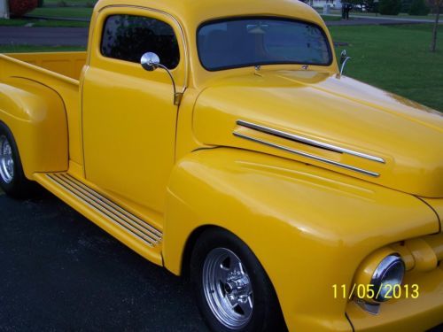 THIS AUCTION IS FOR A VERY NICE ALL STEEL 1952 FORD PICKUP. THE TOP HAS BEEN CHOPPED 3'' AND DOOR HANDLES SHAVED. IT IS EQUIPPED WITH POWER STEERING,POWER WINDOWS,POWER FRONT DISC BRAKES,TILT STEERING AND FORD 9" REAR. IT HAS A GM A BODY FRONT SUSPENSION POWERED BY A SMALL BLOCK CHEVY 383 STROKER AND TURBO AUTOMATIC TRANS. IT RUNS AND DRIVES AS NICE AS IT LOOKS. THIS VEHICLE IS CURRENTLY LISTED FOR SALE IN OTHER MARKETS AS WELL AS EBAY. SHOULD I SELL IT BEFORE THIS AUCTION ENDS I WILL NEED TO CANCELL ALL BIDS AND END THE AUCTION EARLY. IT WILL BE AT THE CLARK COUNTY FAIR GROUNDS IN SPRINGFIELD OHIO. FRIDAY 11-8 AND SATURDAY 11-9 (CARS AND PARTS SWAP MEET) ANY QUESTIONS E-MAIL OR CALL DONNIE AT 937)606-4750 |