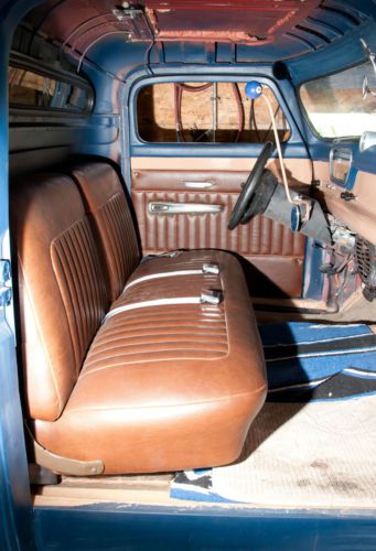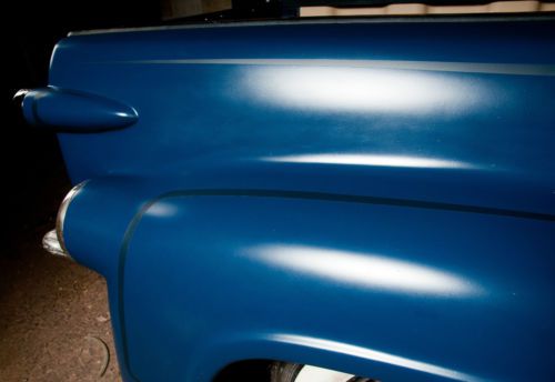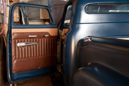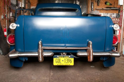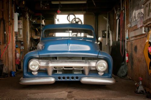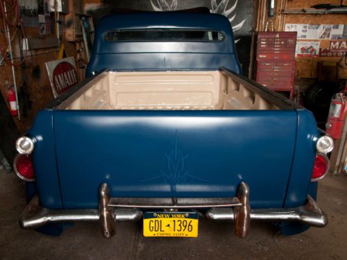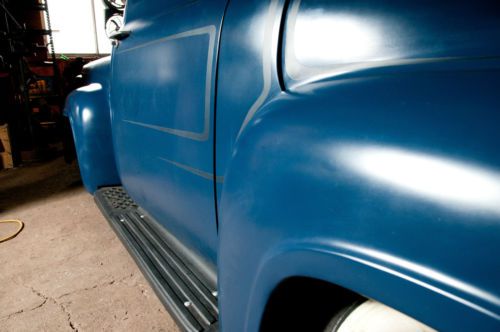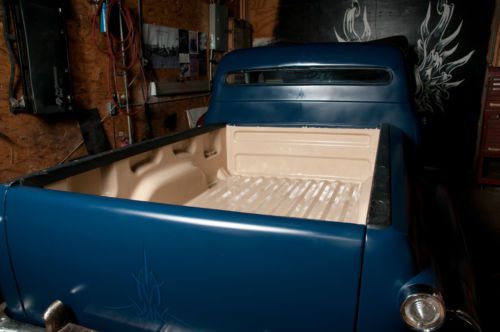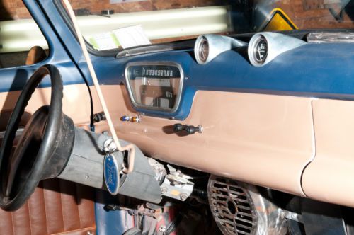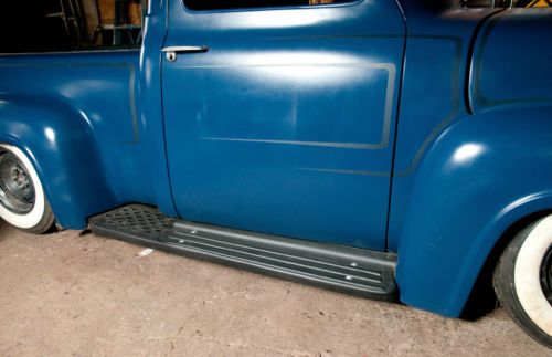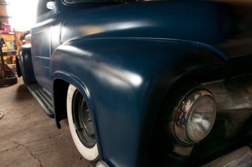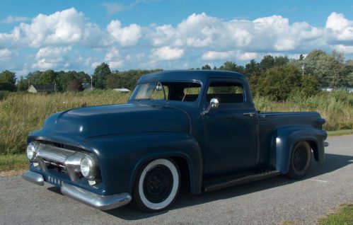 Here’s a sweet 1954 Ford F100pickup! Completed just this past fall it’s as fresh as they come, with the look that everyone wants and all the right modern upgrades to make it drive like a more modern truck. Spend less time cleaning, polishing and tinkering and more time cruising. The truck comes with a NY state registration. This is a custom truck that you won’t find anywhere else. The roof has been chopped 5 inches. The front bumpers are 1958 Chrysler Imperial and the grill has been treated with a POR-15 product over scuff polished steel. The hood has a reverse hinge kit and operatessmoother than most factory reverse hoods. The bed is a Ford Ranger step-side with F100 fenders grafted into it, giving a more appealing look then the old utilitarian beds of the time. The bed also includes a late 80’s flip open Jaguar fuel cap, 1955 Thunderbird tail lights and 1958 Impala reverse lights. The tail gate has been fabricated so it could be removed and a worthy motorcycle could ride in the bed. The rear bumpers consist of a little 50’s Desoto Grill and some 50’s Chevy bumper parts. The running boards are even completely unique. The windshield is a polycarbonate plastical so included with the sale is a solid side glass kit that will still need tobe installed. The paint is a Hot Rod Flatz SteelBlue with old school scallops in a darker navy blue and finished off with beautiful pinstripes laid down by Mark Matyjakowski. http://www.pinheadlounge.com/MarkMatyjakowski The bed has beenlined with a super hard two part epoxy tan finish that will take a hatchet tochip and should possibly outlast the steel it’s applied to. The truck has the drive train of a1994 Ford Ranger which includes power steering, power brakes, disc brakes upfront, independent front suspension and an automatic transmission. This makes maintenance on this truck very easy considering all the parts are very attainable at most any local parts shop. The front brakes are brand new, including all new brake and fuel lines throughout the truck, the rear drum brakes still need to be replaced. The front suspension consists of a brand new DJM Suspension Dream Beams dropped I-beams and the rear is a DJM flip kit. The truck rolls on old 15 inch steel wheels, wrapped in NOS vintage Firestone bias ply wide whites. Inclueded with truck is one spare matching tire. The reverse hinged hood opens up toreveal a strong running 4.0 V6 Ford Ranger engine, with a custom cold airintake. (Consider that they have several V8 swaps available for these frames) The exhaust system has been completely replaced to include the manifolds, down tube and oxygen sensors. Some Thrush mufflers finish off the exhaust with a nice throaty sound and a pair of tips stick out each side of the truck for an old style custom look. The Radiator and A/C Condenser are also brand. This truck has that new car smell we all love as a result of the freshly wrapped seat and door panels. This brown faux leather interior looks and even acts just like real leather and durable enough to be used for outdoor furniture. The truck maintains factory Ford Ranger heat and A/C with the controls hidden in the glove box. The gaugecluster is factory F100 with a working retro-fit speedometer. The custom 50’s Pontiac gauge pods in thecenter of the dash display water temp and oil pressure. Finishing off the door panels with a set of armrests out of an early 60's Ford Fairlane. Another nice little addition is the modified shifter that has been langth end and toped with a number 4 pool ball. NOTE: The two photos of the truck out doors with out the model, you'll notice it's missing it's pin stripes, sits on differant wheels and the windshield it not full. These photos were older and taken before the truck was finished to the point it is now. Model: https://www.facebook.com/#!/MissRubySparkles1