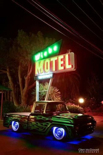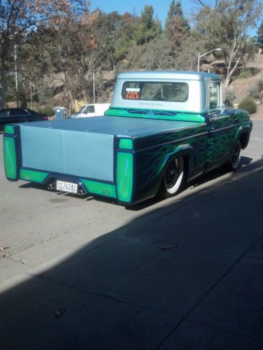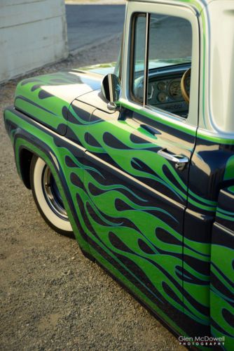 - exterior paint is a dark blue with a lime green flames with a light blue pinstripe outline with pinstripeing designs on the hood and tailgate area. The custom flames and panel layout was done in a true Watson style paint job. The interior paint matches the outside with the blueish silver color. The truck has a few small paint blisters but other than that great condition - full custom body modifications include custom tail lights, custom headlights,custom roll pan front and rear as well as the custom bed cover, shaved all of the emblems.