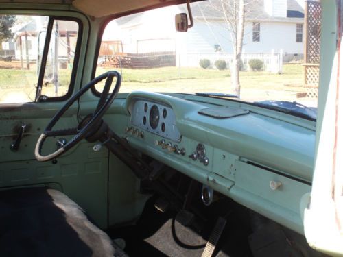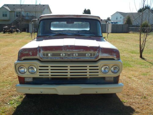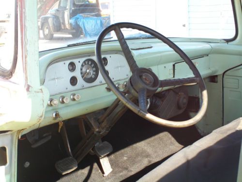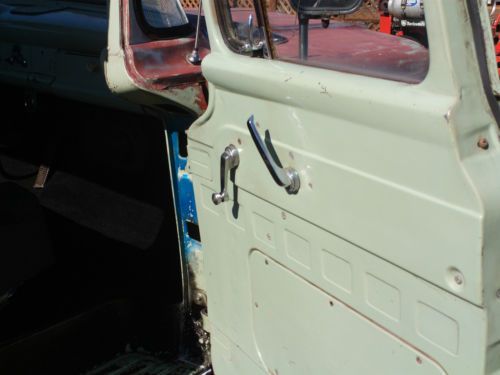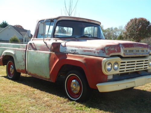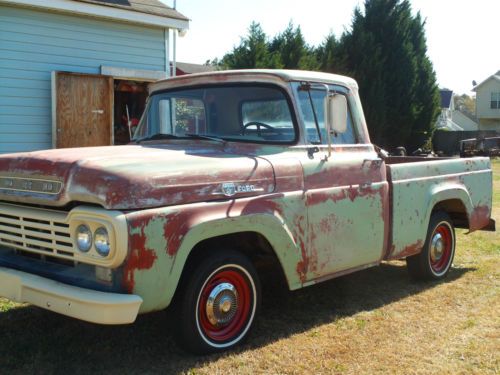 TRUCK IS A GOOD RUNNING, SHIFTING 1959 FORD SHORTBED. MOST OF THE WIRING HAS BEEN REDONE, SO ALL HEADLITES, BRAKELITES, RUNNING LITES AND TURN SIGNALS WOR. THE VACUMN WIPERS WORK, E- BRAKE, HEATER, FRESH AIR VENTS OPEN. STILL HAS FACTORY A-M RADIO. I HAVE NOT CHECKED IT. DOOR GLASS IS CRACKED, BUT WINDOWS ROLL UP AND DOWN , EVERYTHING SEEMS TO WORK, ALSO SPEEDOMETER WORKS. THE RUST IS LOCATED , A SMALL SPOT ON LOWER DRIVER FRONT FENDER, LOWER TAILGATE, AND BED FLOOR. THERE IS AS EXPECTED ON A OLD TRUCK SMALL DINGS ONT IT. THE REAR WHELL OPENINGS ARE DENTED BEHIND THE WHEELS. I HAVENT FIGURED OUT THAT, BUT EASY TO REPAIR. MOTOR HOLDS 60LB OIL PRESSURE, WE REBUILT THE CARB, REPLACE THE FRONT BRAKES AND ONE FRONT BRAKE HOSE THAT WAS CRACKED. ALL WORKS GOOD. THE STEERING BOX HAS NORMAL PLAY IN IT, BUT DRIVES GOOD AFTER YOU GET USED TO IT. ANY QUESTIONS, PLEASE CONTACT ME.