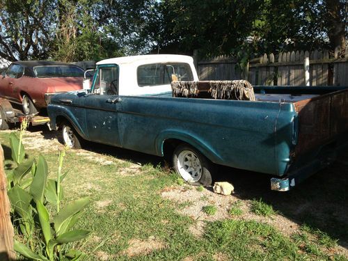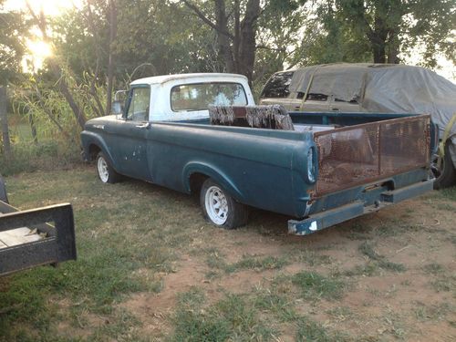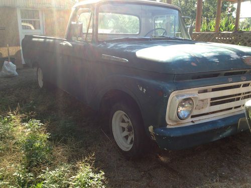 1962 Ford F-100 Uni-body. This truck comes with a clean title and a good current tag. Truck is very solid with about 4 very minor dings in the body mostly about the size of a dime. Windshield has a crack but all other glass is in good condition. I have pulled the fuel tank and flushed it out but not installed it back yet. I do have the seat out, it does need to be recovered. Motor is the original V-6 with standard column shift. Has a new fuel pump, new battery, new distributor cap, rotor and spark plugs. Motor turns over great but will not start as this time. Was last driven about 3 years ago from what I was told. I reserve the right to end this auction at any time for any reason. For more pics. or questions about this truck, please call me (405)268-0423 ask for Wendell.