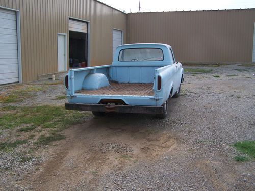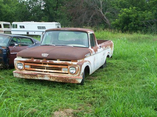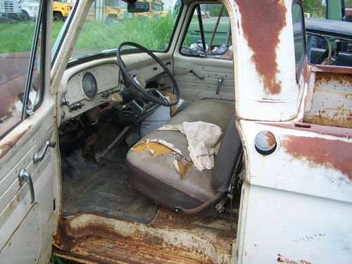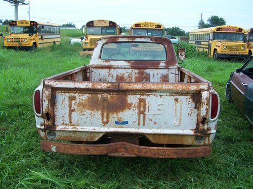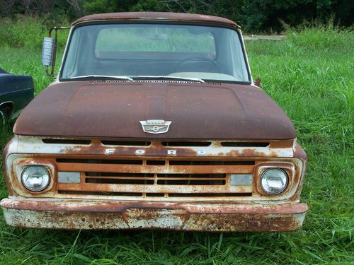 1962 Ford F100 Long Bed Pick Up 6 Cyl Engine, Three Speed On Column Shift, runs and is driveable with normal unibody rust and missing the tailgate. I'd say the forward section of the bed is the worst of the rust. Previous owner had a repaint and the seat done years ago so looks good for a 50 year old pick-up. I wouldn't consider it a daily driver but it has started everytime i wanted to, went the direction i pointed it and stopped each time I asked it to.