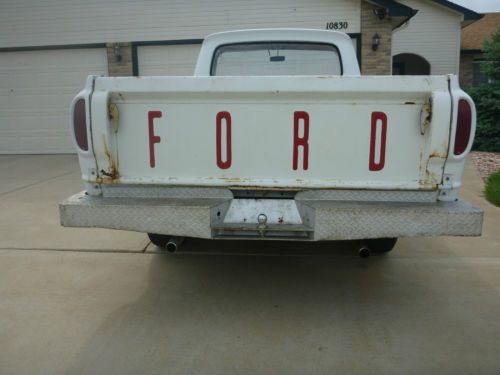 1963 Ford unibody pickup. Great project truck. Runs and drives. Needs work before it would be roadworthy. I have driven this truck to work a few times, but it does have a slight brake wheel cylinder leak on the left rear. The tires are dry rotted, but do hold air. It has the 223 cid 6 cylinder engine, 4 speed transmission and a 9 inch rear end with 3.89 gear ratio. It runs fairly well, but could use a tune up. The body is straight and has rust. (see photos) Not bad for a 63 unibody. Most are very rusty. This one is a great candidate for restoration or a hot rod or drive as is. It has some previous rust/body repair. The windshield is cracked. This is a neat truck, but it is a used vehicle so sold as is no warranty expressed or implied. Buyer is responsible for pick-up or shipping. PayPal deposit of $250 within 24 hours of auction close. Remainder of funds due as cash payment within 7 days of auction close. Any questions call Rob 720-231-5083. Please leave a message if I do not answer.