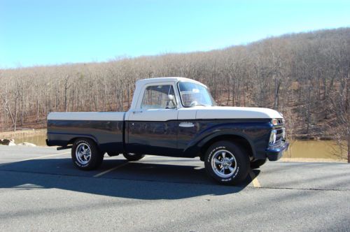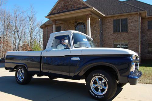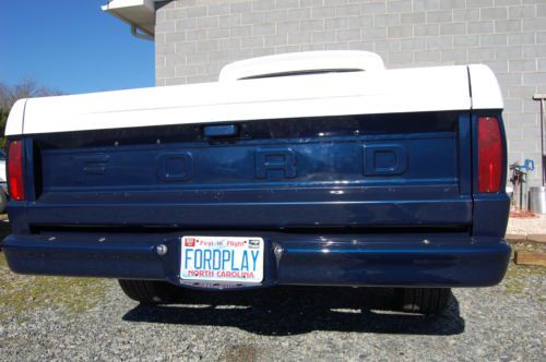 .This is a total off body restoration.Every piece removed,soda blasted to the metal,prepped with etching primer and painted with best paint avalible.I used ford factory colors,for easy matching,and to keep with the original idea.Top color is 2000 ranger white,bottom is a 2006 ford explorer,mettalic blue.This truck is new from front to back.Starting with a total overhaul of the original 352 bigblock V8.It has alittle over 600 miles now.Truck is setting on brand new firestone Indy 500 tires,mounted on Brand new Torque thrust II wheels.10' rears and 8' fronts.Truck also has a custom white oak floor in the bed.Interior is totaly new as well.Seat,headliner.all window seals all new.I spaired no expense and didnt cut ANY corners.The only changes i made from its original state is the custom made alluminim radiator,Tuned headers with duel 2 1/2 in pipes with flowmasters (classic mustang sound).And the custom White Oak floor in the bed.I also have the original wheels and centercaps and,radiator..This was a rust free truck..All original metal,no reproduction parts.Almost 5 gal.of high build primer used,and blocked 11 times to give truck that 21 centery paint job.....Super slick,and like a mirror.I also have about 300 pics to show intire rebuild.winning bidder is responsible for the shipping cost,I will deliver for extra cost,to be determined at time of sell .......Payment is to be certified check,or cash only.Must receive payment with in 7 days of sell,with a 1000 good faith deposit with in 24 hours of sell.......Feel free to call Randy with any questions....336-240-8860