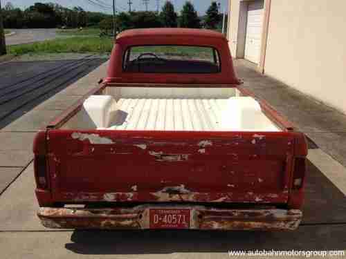 This rare Ford F250 Crew Cab also known as a Six Pack back in the 60's came out of Iowa and was used by a company called Higley Construction. It has been highly altered since it showed up at our shop here in Tennessee. We started by converting the now fully boxed chassis to an independent front suspension and a triangulated 4 bar rear. Because of the length of the vehicle we also opted for a two piece drive-shaft to keep from sectioning the floor. The frame has been stepped up in the front and the rear and fully boxed. Also, a set of Firestone air bags were installed at each corner for ride quality. When it came time to pick an air management system to control the suspension we went with the full Accuair setup. This is a self leveling air management system that has direct control of each corner or three preset settings of your choice. Its as easy to program the settings to your liking as it is to set a preset on your radio. It has a 10 gallon air capacity so that you never have to wait on any air pressure, always plenty on demand. Everything has been painted except the exterior of the truck because we liked that it still wore its original paint. Under the hood and inside of the bed were sprayed Wimbledon white for a cleaner look and to give the next owner a jump on an original two tone paint style. The chassis has also been completely painted top to bottom. You can see these details better on the website under the custom projects section along with the rest of the work that was done. The truck rides on a staggered set of 20x8.5'' front and 22x9.5'' rear billet smoothies and Nitto 555 tires. The engine is a stock 302 roller motor with all the goodies and accessories attached to an AOD transmission and 9'' rear. Lokar lines and shifter were used along with an aluminum radiator and fan shroud with electric fans and a billet overflow. Cal custom valve covers, breathers and air cleaner were used to top it off and all of the plumbing was ran with AN fittings. All of the sheet metal work that was in need of repair has been completed and painted. We just cleaned up the interior a little so that the next person could personalize it to their taste. We started with recovering the dash and the seats and adding carpet front to back. The list goes on and on so feel free to come in and see this truck or feel free to give us a call at 615-220-9000 and ask for Brian. We will be happy to scrape the logos off the truck for the winning bidder if he or she chooses. We welcome any third party inspections if you're unable to come see the vehicle before auctions end. I have no idea what the value of this truck is hence the auction format. Please honor this and do not email or call for the reserve price. Bid to own, thanks.