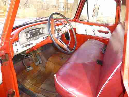 Up for auction is a red Ford F-100 custom cab long bed pickup truck. This truck is in all original condition. Still has the original owners manual in the glove compartment. It has a 300-six cylinder engine that is in great condition. Starts every time and runs great! It has the 3-speed on the column standard shift transmission. This truck runs and drives really good. Recently I replaced the distributor cap, rotor, spark plugs, wires and coil, just as preventive maintenance. The paint does have some spots that have worn through as seen in the photos. But there are very few minor dents and scratches in the body. This truck looks good as is or could be easily repainted to look even better! The muffler looks original and does have some small holes in it. It will need to be replaced. The tires are about 75% or better, see pics. The inside of the cab is very impressive, it is very clean and looks great! Two original lap seat belts are still there and functional. Everything in the cab works except for the horn. The speedometer, all gauges, warning lights, heater, inside dome light, all exterior lights and turn signals, cigarette lighter, wipers, blower motor, radio, windows, all work. The radio is the only thing that I am aware of that is not original to this truck. Everything else looks to be original! The headliner in the truck looks original, but is sagging, see pics. This truck is being sold as is, so please ask any questions you can if it was not answered in the description. This vehicle is available for local pickup only. I will not deliver the pickup, I will make arrangements to meet for it to be picked up. Just send a message or you can call me at 580-262-9163 with any questions. For payment I will require a $500.00 deposit in paypal at the end of the auction and cash or cashiers check for the remainder of the sale amount at time of pickup. Thank You!!