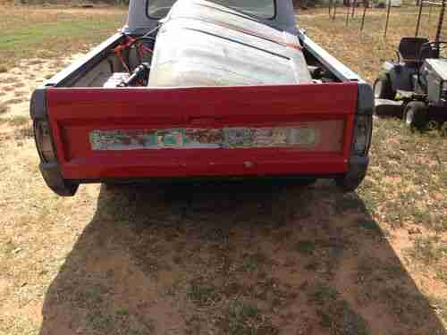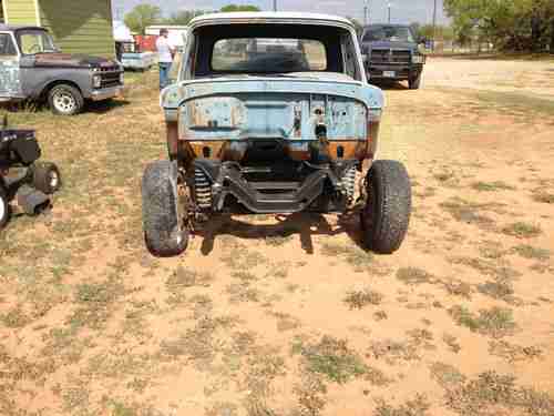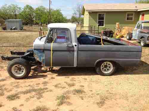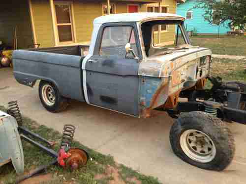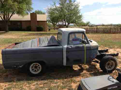 1966 ford f100 short wide bed. Has had the frame stripped and painted and has been rust prevention done on it. It is a really good builder has minimal rust in some of the usual places but has been removed and has had new patch panels put in the floor board and new front cab mounts installed. This would be a great fAther son project or to restore back to original has. Good clean title and is complete.It has been updated with disc brakes on the front from a 79 f100. It is set up for a big block 460 and auto trans but there is no motor and trans with project. it has twon columns that go with the truck one is a auto column and other is a a slick four speed column with nothing moounted on it will have to use a floor shifter with this column, your choice .Also have original motor mounts if want to go back to original motor up to you.