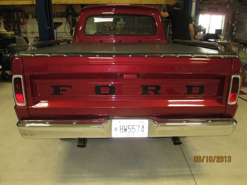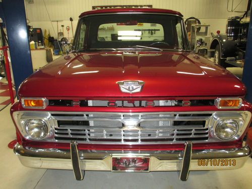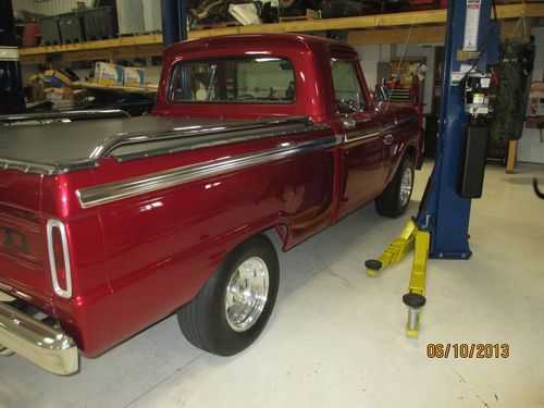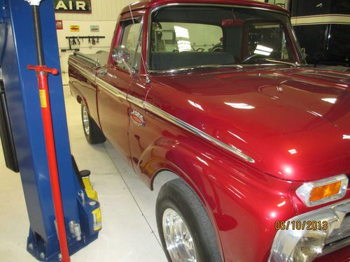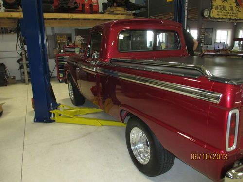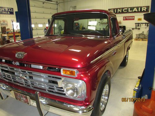1966 Ford F100 custom truck. This truck has had a complete frame off restoration. Everything on this truck was completely taken apart, cleaned, painted, and if worn replaced. The deep red exterior paint is truly amazing and the chrome really sets this thing off. Pictures just dont justify how beautiful this truck really is. It is equipped with a 429 cobra jet engine mated to a Tremec tko 5 speed trans with short throw shifter. Heavy duty bell housing and racing clutch installed along with custom made adjustable traction bars. Everything on this truck is in working order. It has a tilt wheel steering column, radio, and aftermarket vintage air conditioning. Blows cold! Very meticulous detail was put into the truck. Even the steering wheel matches the wheels. The truck has around 3,000 miles since restoration. This truck is a true joy to drive (lots of power) and is a real head turner. Shipping can be arranged at your cost. Any further questions give Dave a call. (608)289-8189 Best of luck!