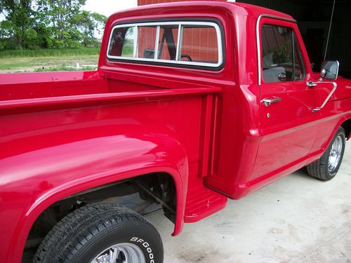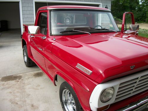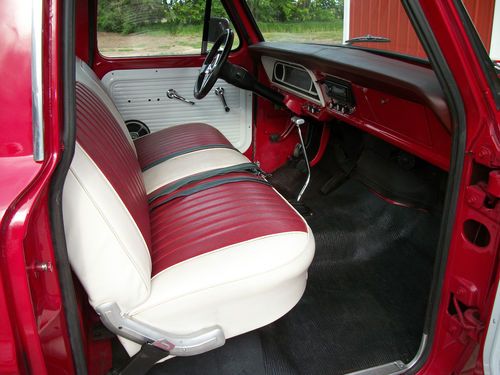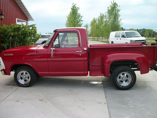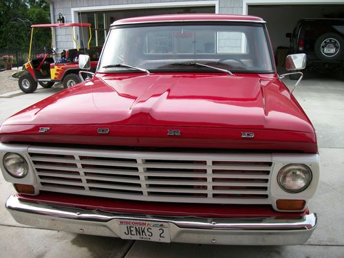 Selling my 1967 Ford pickup. It is a very nice and dependable driver. It has a 1 year old paint job that shines very nicely. The dash on the truck has a crack in it from the Nevada sun. This truck was purchased from Neveda and has been in Wisconsin for just a few short years but has not been driven in the winter and has always been garage kept. The engine compartment is clean and the engine has some chrome trim on it. The rims are Craeger SS with very good tire tread left. It has a 4 speed floor shifter. The exhaust are duals with thrush type mufflers, sounds really good but not loud. It has a wood bed with stainless steel slides. This is a nice summer driver and will give the owner a reliable classic to drive and enjoy. The underside of this truck is exremely clean, especially for a 46 year old truck.
