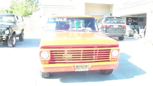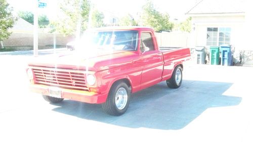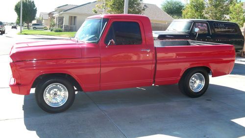 RARE1967 FORD F-100 SHORTBED FLEETSIDE RANGER, ALL NEW PARTS, A NEW POWERFULL 390 BORED .30 UNDER,CRANK .10 OVER HEADS HAVE BEEN DECKED AND ALL BRASS VALVE SEATS,THE MOTOR WAS BUILT BY A SPEED SHOP. 9.51 FLAT TOP PISTONS,A STAINLEESS STEAL RINGS. SQUARE PORT HEADS . NEW ELDERBROCK PROFORMER INTAKE ,NEW HOLLEY 600 CFM CARB. COMP R V CAM .HOLLY 1.3/4 HEADERS RUNNING DUEL 3 '' FLOWMASTERS DUMPING IN FRONT OF REAR AXLE. MAKEING ABOUT 400 HP... A NEW 3 ROW 1'' CORE ALUMIUM CHAMPION RADIATOR . A NEW DUAEL BRAND POWERED CODED CHROME SCHROUD W/ DUEL 13'' 4000 CFM FANS. A NEW BILLET OVERFLOW,AND A STAINLESS STEAL TOP GRILL COVER. NEW CHROME 7'' DUEL DIAFRAM BRAKE BOOSTER. SPECTER AIR FILTER. NEW BOSCH BATTERY.NEW WATER PUMP.NEW 160 AMP ALT.AND A BRAND NEW VINTAGE AIR A/C HEATER UNIT,KEEPS THE TRUCK NICE AND COLD . A NEW C-6 TRANSMMISION. A NEW REBUILT FORD 9'' REAR END RUNNING NASCAR 3.00 GEARS. I USED THE TALLER GEARS FOR BETTER GAS MILAGE .THE GAS TANK WAS RELOCATED TO BACK UNDER THE BED AND THE OLD FILLER NECK WELDED IN . ALSO WELDED IN WHERE THE BEDS POST POCKETS AND ANTENA. ALL WIRES AND HOSES ARE WRAPED IN RED WIRE LOME PLASTIC.THE INTERIOR IS 100% NEW BLACK VELVET AND VINAL SEAT .VINAL HEADLINNER AND DOOR PANNELS IMATATION ALAGATOR PATTERN. COSTOM GAGES BUILT IN A HAND FABED