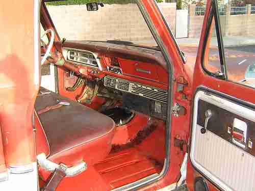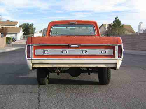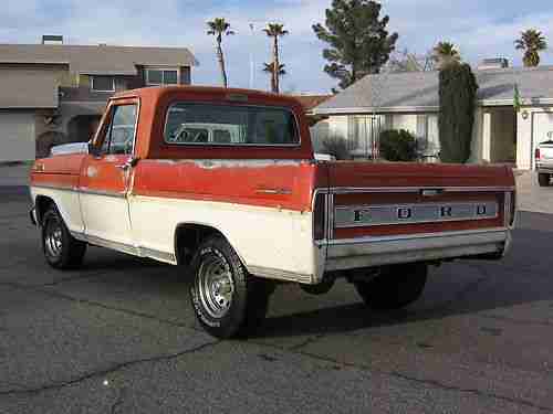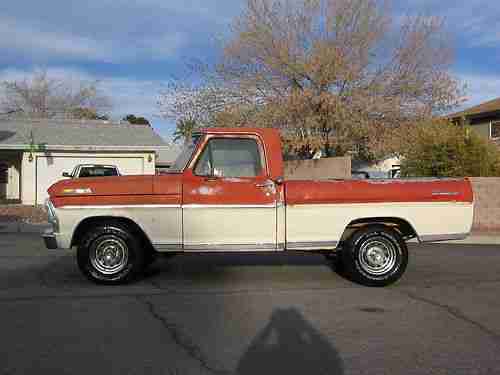 Up for auction is my 68 Ford F-100 Ranger short bed. The truck has a good running 360 V-8 with an automatic transmission and factory air conditioning! This is a rock solid truck with absolutely no rot with the exception of some light surface rust on the bed and hood. The truck has spent its whole life in the dry Arizona desert. The dash is cracked in pieces and the door pulls were cracked as well. The body is super solid with a couple dents and dings as you can see in the pics. This truck is almost totally complete except for some trim pieces and the rear bumper. Somebody also at some point took the A/C compressor off the truck. This is an awesome original paint two owner short bed that runs great and has the best set of floors I've seen in a long time. I took the worn out carpet out to show how good the floors are. I kept a small piece of the carpet so you can color match it later. This is a great short bed that would be perfect to fully restore or drive it as is right now! The reserve is set low so BID TO WIN!! This truck will be sold as is where is with no warranty implied. I also reserve the right to end this auction early as the truck is for sale locally.