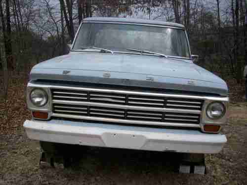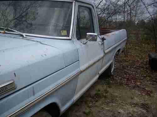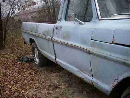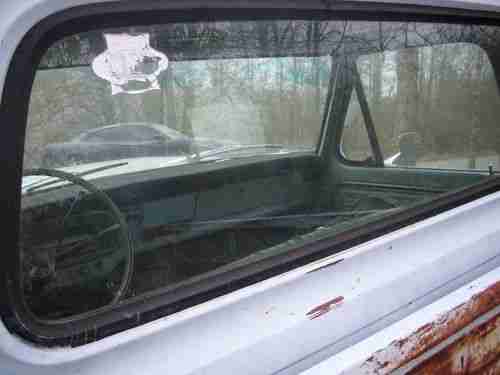 This is a 1968 ford F100 that has 94,200 original miles. I am 2nd owner. I knew the guy who bought it brand new in '68. The paint is the original paint. I have put less than 200 miles on this truck since I bought in approximately 10 years ago. I kept it in a barn these years. I have put the following parts on this truck and have receipts. new starter, alternator, exhaust from motor back, master cylinder, Gas Monroe shocks, halogen head lights, dimmer switch, windshield washer system, (needs to be put on), fan shroud, plugs and plug wires, carburetor, air filter, oil and filter, all new hoses, fuel tank has been took off and cleaned, battery cables, PVC caps on valve covers, rubber from filler neck to tank, rubber grommet around filler neck, all lights work (brake,signal and taillights) even has Ford hub caps. Truck overall is in great condition but not MINT condition. Now the BAD STUFF: It has a small dent on driver front fender and passenger door. The bed is rusted through on the driver side where leaves were not removed. Seat is wore on drivers side. Would be a good idea to replace water pump due to sitting. Tires are dry rotted and not trust worthy due to being stored for so long. Truck was being put back as original as possible.
