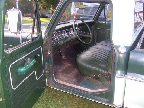 This is a nice driver F100. It has a great running 302 that was rebuilt by the former owner about 5 years ago and has a mild cam and 2 brl carb. It has an automatic transmission that changes as it should. This truck is not cut up or molested in any way. The former owner repainted the exterior, replaced the floor mat and recovered the seat about 8 years ago. This truck has mostly been sitting in the garage except to get it out and wash it and run it around the block to keep the battery up. Interior looks good and all gauges work along with all lights. It doesn't have power steering or power brakes and no A/C, just heat and radio. Very little surface rust around the bed joints and drip rails. This is a very clean truck but not a show truck just a great driver. It leaks a little oil but very little and doesn't smoke at all. Dash is cracked up around speaker in center. Radio works along with wipers, gauges, lights, heat, and signals. Questions call (864)915-6437 or email me. It is also a short wheel base and paint looks pretty good and not faded. Tires are in great shape. I think I have covered most everything. Thanks and Good Luck!