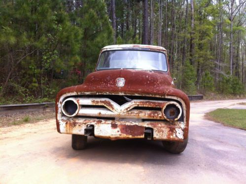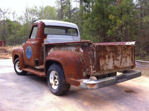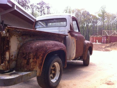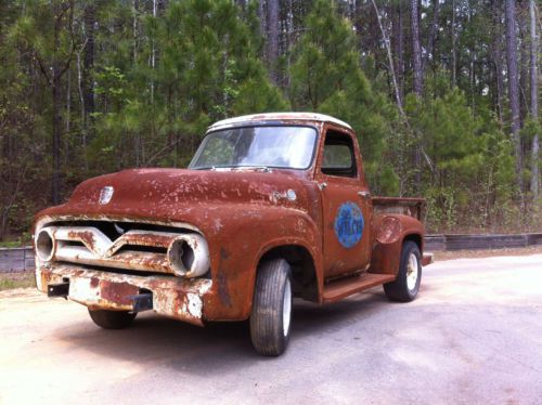 Incredible Rat Rod just waiting to happen - I picked this 1955 f100 up about a year ago with plans to make a great rat rod out of it, but have too many projects to tackle this one right now and I hate to see it go to waste. Truck was white, but previous owner stripped it to the metal to allow it to 'age', then got tired of it and sold it. Truck has no motor or transmission, no seat or interior. Has original spring front end and 9" rear end. Frame appears to be in good shape, cab has typical rust: rockers, cab floor and cab corners. I have new sheet metal for the cab corners and rockers, but not the floor. Cab floor has been covered with fiberglass at some point in the past...my plan was to replace the floor completely along with the rockers. Doors have rust in the bottoms. I believe most, if not all, of the door glass, window operators, headlights and grille components are in the cab of the truck. What you see in the photos is how I purchased the truck, I have not touched it since bringing it home. Inner fenders are in good shape, as is firewall metal. Original steering wheel and manual column are in tact, as are pedals. Truck has a ton of possibilities, I would love to see this go to someone who wants to tackle a big, but worthwhile, project.
