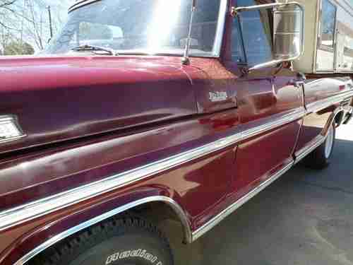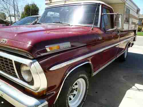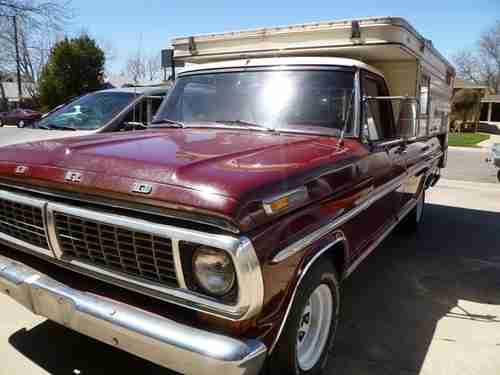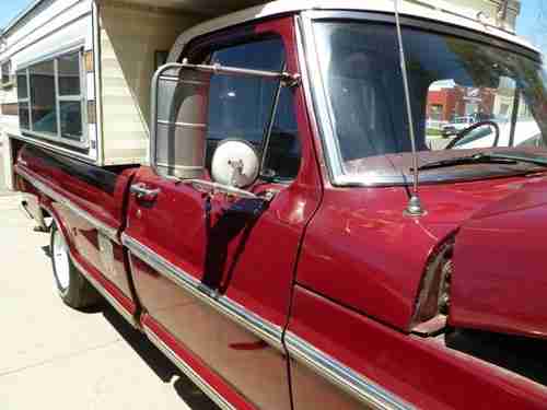 This F100 was donated to our organization, step 13, (www.step13.org). The donor purchased it in 1983 and put a pop up camper on it. The truck comes with the camper. I can't tell you all the history on it but what i can tell you is that it runs and drives. 4 new tires. its a 4 x 2. Has a CB radio. Cracked widshield. It reads 70-something K on the odomater but i have no idea if that's real or whether its turned. It looks very well cared for. It was originally bought in Colorado and our donor who i believe is the second owner, also lived here in Colorado. I don't see any rust.