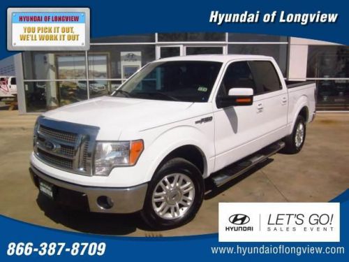 2010 Ford F-150 2WD SuperCrew 145 Lariat Hyundai of Longview presents this CARFAX 1 Owner 2010 Ford F-150 2WD SUPERCREW 145 XL with just 44411 miles. Represented in WHITE. Under the hood you will find the 5.4L V8 24V MPFI SOHC Flexible Fuel coupled with the AUTOMATIC. Options and Safety Features: Nicely equipped with 3-point safety belts at all rear seat positions AdvancTrac w/roll stability control (RSC) Anti-lock braking system (ABS) Auto lock safety belt feature for child seats Center front 2-point safety belt Dual note horn Dual stage driver & front passenger front airbags w/passenger off switch Dual stage driver & front passenger seat-mounted side airbags Outboard front lap & shoulder safety belts -inc: height adjusters pretensioners energy management retractors Rear door child safety locks Safety canopy front/rear outboard side curtain airbags Tire pressure monitoring system. Awards And Accolades: ALG Best Residual Value Hyundai of Longview WE WILL BEAT ANY DEAL! At Hyundai of Longview our goal is to provide you with an excellent vehicle purchase and ownership experience. For the finest in personal customer service please contact the Internet Department directly through this website. Also please note we take great care to keep our listings up to date however our inventory changes daily and not all inventory is online. If you do not see what you are looking for then please call. We look forward to providing you with excellent customer service and welcoming you as a Hyundai of Longview client. You can reach us at 888-464-8850 or by visiting us online at www.hyundaioflongview.com. Please call for more information. Please call us for more information. "You pick it out and We'll work it out!"