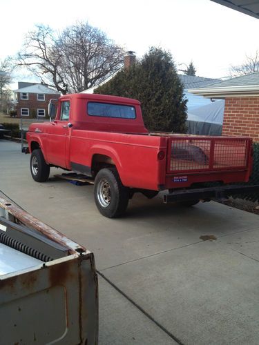 1959 F-250 4x4, (first year for the factory 4x4) runs and drives, 292 V8 and 4 spd manual trans, frame is solid but shows rust due to age. The truck has new brake lines and it looks like wheel cylinders all on it when I got it, brakes work great. This is a project that comes with a good 4x4 cab with the braces at the base of the rear cab, 4 more doors, and bed (since the cab and bed on the truck are shot), blasted and primered front inner fenders and core support, stripped and epoxy primered front fenders and valance, another set of factory f-250 axles, transfer case, drive shafts, low mileage t-98 4 spd trans, another set of front and rear springs and misc parts from another 4x4 250 that was taken apart for resto. New from NPD rear spring shackles, and leaf spring pins. Rear tires are usable fronts are shoot. Buy it now price includes all the parts or take what you want. If reserve or buy it now is not met I may relist the truck buy itself. DO NOT BID IF YOU HAVE LESS THAN 10 POSTIVE FEEDBACK comments without contacting me first. Send me your phone number and a good time to contact you if you have any questions and want to talk about the truck and parts. I will work with your shipper but you need to make all the arrangements. Open for inspections prior to bidding the vehicle is 54 years old and shows it.