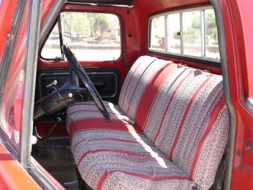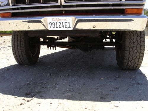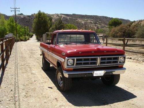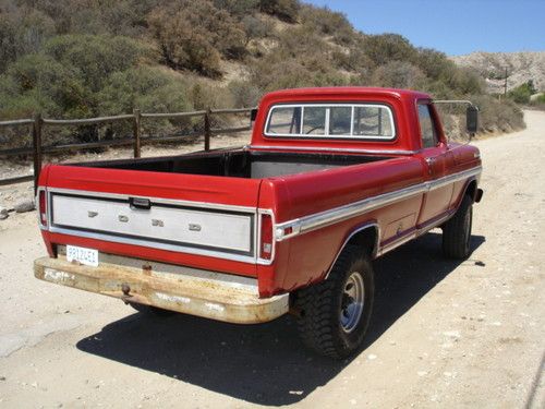 1972 ford F250 highboy 4x4.Truck has a 360fe v8 with an edlebrock intake and holley 750 4bbl carb. 4 speed trans and 4 wheel drum brakes. 4x4 works good truck shifts through all the gears. There is typical rust in the floor boards as shown in the pics but the frame, fenders and cab corners are rust free. The truck was a farm truck in Santa Barbara most of its life. Overall its a good running project truck that needs a little tlc but could b driven as is. All the lights work and the speedo oil pressure and alt gauges work. Fuel gauge needs a new wire run from the sender and the temp gauge needs a new sender. It is also missing the passenger side mirror strut, It could also use a passenger side exhaust gasket. The seat under the horse blanket cover is also in pretty rough shape. Also it is a 10 foot rattle can paint job. the truck was sanded and prepped pretty well and it looks good for a farm, work, play truck but it is by no means show quality. The truck is currently registered with a clear title. Please ask any and all questions before bidding. I require a $500 dollar deposit within 48 hours of auctions end. buyer must arrange shipping.