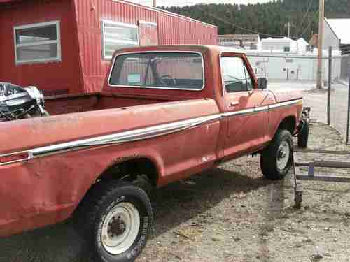 75 FORD 4X4 HIGHBOY, BAD ENGINE,HAS 400 WITH FLAT CAM,TRASFERCASE HAS BEEN REBUILT BOTH FRONT AND REAR DIFF S ARE REBUILT 411 GEARS WITHIN THE LAST 1000 MILES, WE PERCHASED THIS TRUCK FOR THE NEW MOTOR THAT WAS IN IT THE 400 CAME OUT OF THE OTHER TRUCK IT GOES WITH THIS ONE IF YOU WANT IT, IT HAS A GM STEERING BOX DONT KNOW WHY BUT THATS WHATS IN IT, NO TAIL GATE , HAS 5TH WHEEL PLATE, BODY HAS SOME RUST AND DINGS & DENTS HAS A CLEAR TITLE, ASK ALL QUESTIONS GOOD LUCK