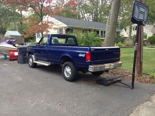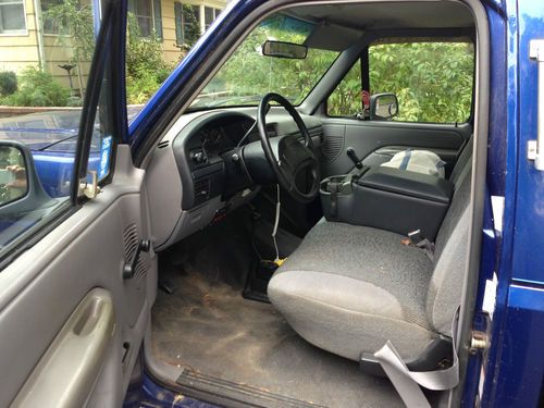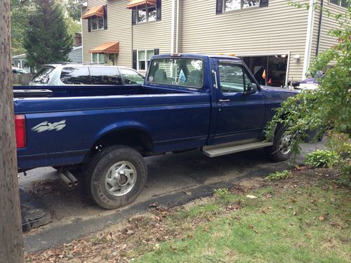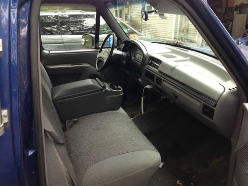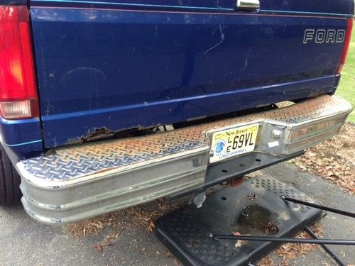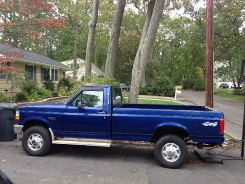 sold as is. good truck with typical ford rust, saggy bumper. minor dings and scratches. exhaust leak from pipe and engine somewhere. rear fuel neck needs to be replaced. fuel switch works. 8' bed with small tool box. new antilock brake system last year. newer tires on rear. new cd player and speakers. solid truck. plow is about 4 years old. only plowed 1 lot. drive in mount. all hydraulics work. up down good. left right seized. penetrating lube and pressure on a curb or tree and it will break free. happens every year no matter how much i lube it. i'm told that is a common plow issue.