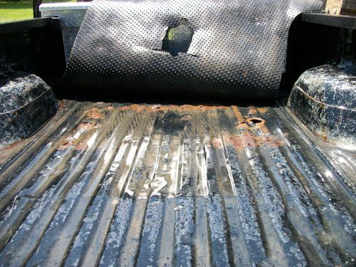 3. Under the rubber bed liner is the area where the previous owner had a Gooseneck Trailer Hitch mounted. As seen in the pictures some rust has started around the bolt holes. This does not affect the operation of the truck.