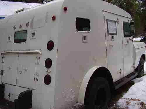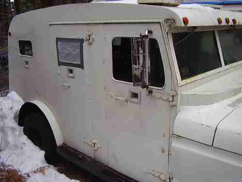 1978 Armored Truck Sitting on a Ford F-350 Dually 1 Ton Chassis. Moore and Sons Armored Truck completed by McHenry Truck Equipment Inc. March 1978 St. Louis,Missouri. Great Advertisement for your Restaurant Business, Bail Bonds, Rock 'n Roll Band,Check-Cashing Service, Auto-Parts Store,Car Shows, You name it because it's a real conversation piece grabbing lots of attention everywhere. The Engine is a 351 m Cleveland with a C6 automatic transmission. The truck runs and drives but the brakes are wimpy and need work. The carburetor has been rebuilt. It is 2 wheel drive. It is a very solid truck with little rust overall. The weight of the truck is 9500 pounds. The body overall is in good condition. Restoring her to her grand old days would be a fun and easy project.All the bullet proof glass is there except two small pieces right and left side. The passenger window has a crack and the right drivers door has a crack. Has eight gun ports that slide open and lock shut. Has 2 Cash Doors 1 Big one in the rear and one behind the driver. Lots of steel opening roof vents with steel screens.As you know if you have been looking very few vintage Armored Trucks come up For Sale anywhere so this is a rare opportunity. I bought it to restore it and use it for Advertisement and Marketing but my wife's health went south taking my full-time for her and the children. I have placed a reserve price that in my opinion is very fair, if not low on this unique piece of history. Need $500 nonrefundable deposit required within 24 hours of close of auction and full payment within five days from the close of the auction and prior to pickup or delivery.All necessary arrangements for Shipping or pick up are the responsibility of the buyer. I am a very reasonable person so if pickup arrangements are made in a timely fashion I will work with you to assist in things. If there is a need to store the armored car for a couple months before pickup that can be arranged also. Payment must be made in full and I will at that time send you the title. This armored car is a very nice piece to restore, don't miss out on this one! The best way to contact me is by phone for I am in the mountains on dial-up Internet service which is a pain and I sometimes do not check it daily. Please feel free to call me with any questions or information needed at:( 208) 667-4497. Please leave a message if I'm not able to answer and I will call you back as quick as I can. Thanks for looking and have fun bidding!