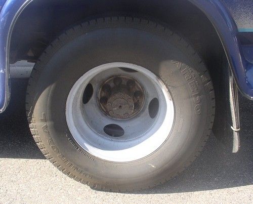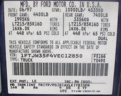 I have here a 1997 F-350 Crew Cab Dually Powerstroke. It is the Mark 3 series with all power accessories, including a new factory TV w/video cassette tape player, and it still works.This has a 7.3 liter diesel engine with turbo. It has an E40D automatic transmission and not quite 184000 miles on it. It was built with the tow package which consists of a flip up ball for goose neck trailers, factory rails for a fifth wheel hitch as well as a 10,000 lbs rated bumper for pull behinds.Truck was recently serviced with tie rod ends and rear axle seals. A picture shows the factory sticker which indicates that the factory tires are 215-85-16, however, all crew cab models with the "Tow package" are sold with 235-85-16 tires that are rated for towing most anything. These tires have excellent tread, but, are dry cracked from not much use these past ten years. The only other issue with this truck is that the cruise control stopped working on my last trip to Texas. Front leather seats needs to be covered or redone to original and the windshield needs to be replaced. Kelly Blue Book values this truck at $8750. My reserve is less than then that.