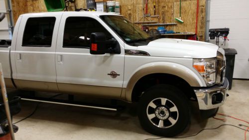 2013 F350 SRW FX4 Lariat crew cab long bed (love the extra large 38 gallon fuel tank), white/tan, fully loaded. Diesel, 3.31 locking rear differential (great for gas mileage yet doesn't affect max pulling), fifth wheel hitch prep package with gooseneck hitch, skid plates, navigation system, rapid heat supplemental heater (great during winter, immediate heat), wheel well liners, up fitter switches, extra heavy duty alternator, universal garage door opener, leather, heated seats both front and back, two tone paint, Lariat interior package, bodyside moldings, running boards. All maintenance (2 full service changes) done at dealer. Line-X bedliner, weather tech floor mats, Bakflip F1 low profile bed cover, Bakflip toolbox and seat covers for front and back. 1 owner.