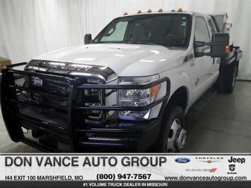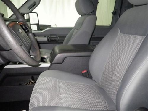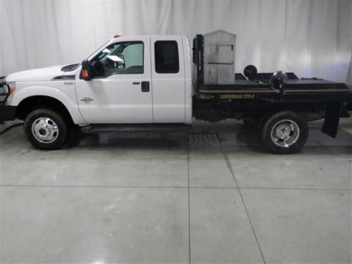 Roof clearance lights, tinted windows, front tow hooks, fog lamps, cattle guard, steel feeder, powered tow mirrors, 17 inch aluminum wheels, mud flaps, rear tow hitch, dual rear tires, side step running boards, gooseneck hitch, and a Cannonball Steel flatbed. 4WD. SuperCab. Engine is a 6.7L V8 Power Stroke Diesel with an automatic 6-speed transmission. External color is Oxford White. Interior has Steel colored Premium cloth over front two bucket seats, and the rears' regular bench configuration. Windows, mirrors, and locks are all powered. Up-fitter switches, trailer brake controller, CD player, on-wheel audio/cruise controls, and an auxiliary input jack.