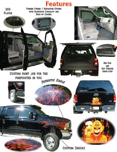 Options: Back-up Camera, Navigation, DVD Player with Headphones, Bluetooth, Rubicon Quad Shock System, Super Lift Steering Stabilizers, Hot Sprayed Arma-Coat Truck Bed, Chassis has Class 4 Hitch and 30,000 lb.Goose Neck, K&N High Flow Air Filter, Custom Interior and Exterior Lighting, Airbrushed Firefighter and Patriotic Graphics, Graphics applied by "The Arsonist", Show Truck, Massive Amp and Speakers, Serviced by Ford Every 5000 miles, Custom Stainless Bumper Rated 1,000 lb. Tongue wt., Bed Rug Carpet Insert, 2" Super Lift, Stainless Body Accessories, An ideal, nearly new truck for towing toys!, 4-Wheel Drive, CD Player