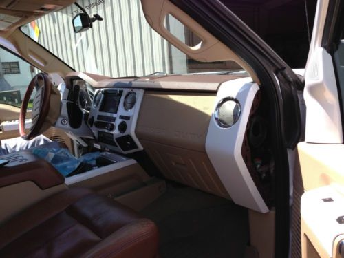 i have for sale a 2011 Ford King Ranch. I had it custom painted white with ice blue pearl and 5 coats of high grade clear to give it that one of a kind shine. While it was in the paint shop I had some of the interior pieces painted to match. The truck sits on 24" American Force wheels with load rated 315/50/24 Nitto Terra Grapplers with 70% life or better. The truck had the front end serviced about 10,000 miles ago with all the Moog parts they have. It also has Pro Comp dual steering stabilizers with Bilstien 5165 remote reservoir shocks all around, with a cost of $1,500 in shocks alone. For towing the truck has the Firestone rear air helper bags with the Air Lifter wireless one control so no gauges have to be in the cab cluttering and the factory ford brake control helps keep everything in control. It has the Cadillac Escalade roof racks with a KVH tracvision sitting on luggage racks. It has the B&W gooseneck hitch with light plug in the bed.