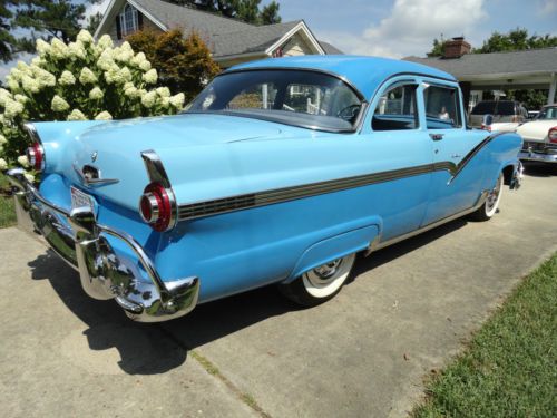 1956 FORD FAIRLANE CLUB SEDAN 1956 FORD FAIRLANE CLUB SEDAN. THIS CAR HAS BEEN FRAME ON RESTORED LESS THAN A YEAR AGO. BEAUTIFUL TWO TONE BLUE EXTERIOR WITH BLUE INTERIOR. FRESHLY REBUILT AUTOMATIC 312 THUNDERBIRD ENGINE. POWER STEERING AND POWER BRAKES. 5 NEW DIAMOND BACK RADIAL TIRES. WIRE SIMULATED WHEEL COVERS. STONE GUARDS WITH ROCKER CHROME MOLDING. CORRECT DUAL EXHAUST THROUGH BUMPER WITH EXTENTIONS. VENT SHADE. DOOR HANDLE SCRATCH GUARDS. ACCESSORY BUMPER GUARDS. CHROME AND STAINLESS IN EXCELLENT CONDITION.