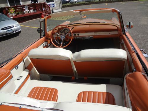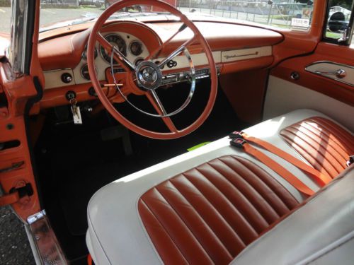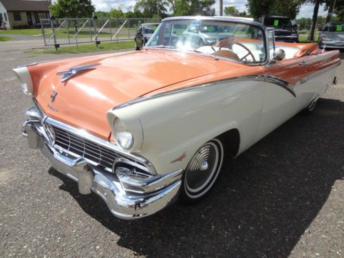 Hello, Gorgeous Classic 1956 Ford Sunliner Convertible from Southern Mo. in great original condition. Original Thunderbird 312 V8 under the hood with a 3 speed automatic transmission. Power convertible top in great condition! Power steering for your driving pleasure!Also the Sunliner has RARE Factory Power Seats and Power Windows! Very stylish factory Through the Rear bumper Dual Exhaust. This car rides and drives whisper quiet and as smooth as a Babys butt! Mandarin Orange over Colonial White original tutone colors from factory with matching Interior in great condition. Always Garaged and pampered by proud owner. Very reliable driver that I would take Cross Country with confidence or around the Lakes after Dinner cruise. Great fun wheels and investment too! They don't make 50s convertibles anymore! Call with Questions Woody 651 303 7769