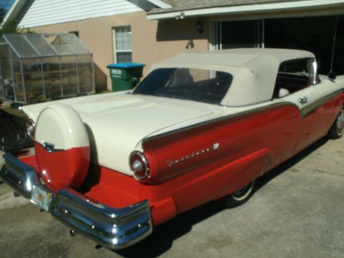 1957 FORD FAIRLANE 500 CONVERTIBLE. 292 AUTOMATIC, POWER STEERING.NEW TOP CYLINDERS AND MOTOR, ENGINE AND TRANSMISSION REBUILT. NEW BRAKES AND RUBBER LINES. NEW POWER STEERING HOSES.ALL NEW INTERIOR INCLUDING RUG.DOOR PANELS,SEATS,ETC.HAS SKIRTS AND CONTINENTAL KIT.NEW TIRES.ORIGINAL WORKING AM RADIO.RUNS AND SHIFTS FINE. NICE CRUISE NIGHTS CAR,.DOES NEED A HORN WIRE WHICH I HAVE BOUGHT FROM MACS.CAN NO LONGER DRIVE AND MAINTAIN AS FAILING HEALTH LIMITS MY ABILITIES TO DRIVE. 94,455 TITLED ORIGINAL MILES.I RESEVERE THE RIGHT TO END AD EARLY AS CAR IS FOR SALE LOCALLY,CALL LOUIS IN DELTONA FL. 386-860-8858