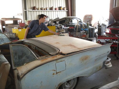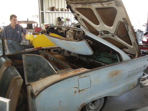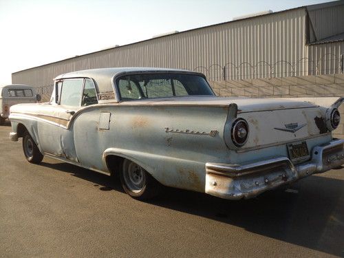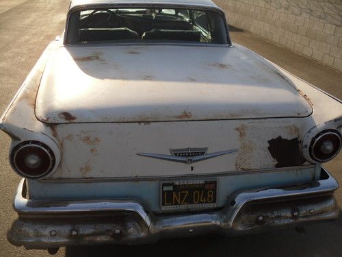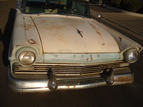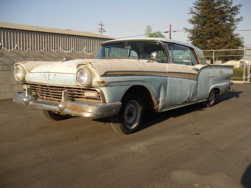 HERE WE HAVE A RARE 1957 FAIRLANE 500 RETRACTABLE HARDTOP,VEHICLE NEEDS COMPLETE RESTORATION DOES NOT RUN OR DRIVE.TOP WORKS HAVE PICTURES OF TOP GOING UP ALL THE WAY AND DOWN ALL THE WAY USING FACTORY SWITCH.VERY COMPLETE NEEDS BOTH DOOR GLASS AND ONE WINDWING REPLACED AS THEY ARE CRACKED, FRONT AND REAR GLASS ARE VERY NICE.HAS A LITTLE RUST IN THE PASSENGER TOE KICK, REST OF FLOORS ARE NICE, AND RIGHT REAR QUARTER HAS RUST AT BOTTOM SEE PICS. I HAVE OTHER PICTURES AND CAN EMAIL PICTURES OF ANY AREA YOU MIGHT BE CONCERNED WITH.THERE IS NO RUST IN THE REAR COMPARTMENT FOR TOP OR SPARE TIRE WELL.THIS IS A VERY SOLID CANDIDATE FOR RESTORATION.HAS POWER STEERING POWER BRAKES POWER WINDOWS AND POWER SEAT.THE WATER PUMP POWER STEERING PUMP AND PLUG WIRES ETC ARE OFF ENGINE AND IN A BOX IT HAS THE 312 ENGINE. I DO NOT KNOW CONDITION OF ENGINE OR TRANSMISSION YOU SHOULD ASSUME IN REBUILDING THEM AS PART OF RESTORATION.INTERIOR IS ALL THERE BUT AS SHOWN IN PICS NEEDS COMPLETELY REDONE.DRIVERS DOOR HAS WRINKLE AT BOTTOM BUT OPENS AND CLOSES AS IT SHOULD.ALL EXTERIOR TRIM IS ON THE CAR IT IS MISSING FORD EMBLEM ON STAINLESS TRIM WHERE IT SAYS SKYLINER ON REAR CORNER OF TOP.THE PAINT APPEARS TO BE ORIGINAL.VEHICLE HAS NOT BEEN REGISTERED SINCE 1981 I HAVE A CLEAR CA. TITLE.PLEASE LOOK AT ALL PICTURES AND UNDERSTAND THIS IS A RESTORATION PROJECT YOU MUST BRING A TRAILER IT DOES NOT RUN.I AM NOT BROKE GOING THRU A DIVORCE OR ANYTHING ELSE I AM SIMPLY THINNING THE HERD SO TO SPEAK. SO BE REASONABLE IF CALLING TO MAKE AN OFFER AND KNOW THIS IS AN AUCTION TO GET AS MUCH AS I CAN.THIS IS A 56 YEAR OLD CAR THAT HAS BEEN SITTING SINCE 1981 SO KEEP THAT IN MIND IN YOUR EXPECTATIONS.I CAN BE REACHED AT 1-661-333-7557 PLEASE CALL AND ASK QUESTION AND PLEASE BE SERIOUS, THERE IS NO WARRANTY OF ANY KIND EXPRESSED OR IMPLIED. BUYER IS RESPONSIBLE TO RESEARCH VEHICLES WORTH. VEHICLE IS AVAILABLE FOR INSPECTION 8-5 MONDAY THRU FRIDAY EXCEPTIONS CAN BE MADE IF NOTIFIED IN ADVANCE. ALL SHIPPING ARRANGMENTS AND COST ARE BUYERS RESPONSIBILITY,THANK YOU. "NOTE" DO NOT ASK WHAT THE RESERVE IS IT'S AN AUCTION I AM OPEN TO REASONABLE OFFERS NO TRADES.