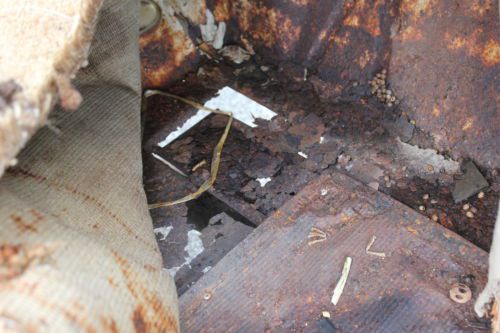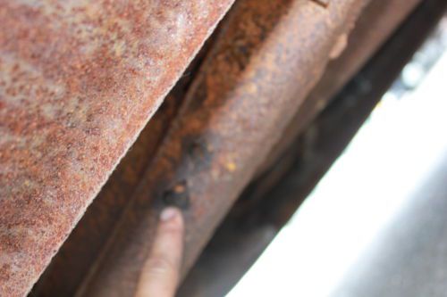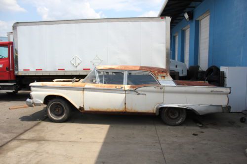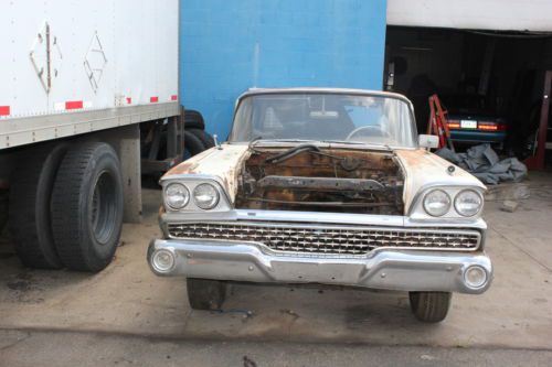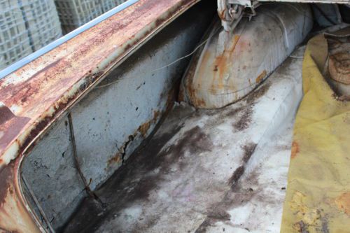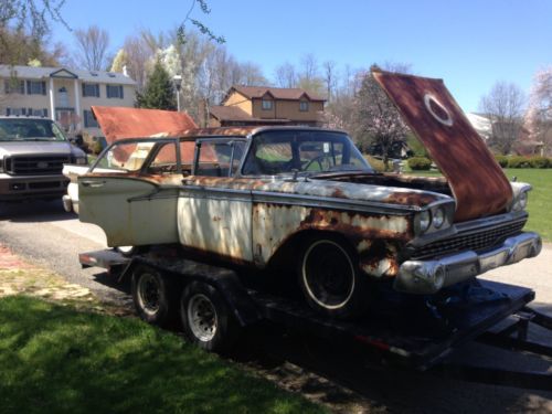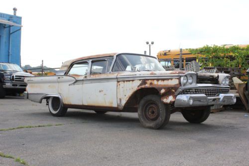 What you are looking at is a 59 Ford with a TON of patina. It was to be built for a rat rod event this Fall but we have aborted the project due to 3 full blown 100 pt. restorations that have arrived. The trunk is super solid. The passenger floor board is the worst, drivers has some issues. (if not doing a full restoration it wouldn't take more than a few hours to weld some new sheet-metal in). The frame is structurally strong, a few small side holes that I did take pictures of. There is no motor, no transmitting or pumpkin in the rear (has axles and 9" housing). This is a roller. Headliner is in great shape. Has some seats, not sure from what. Does also have an exhaust system with a glass pack (single)