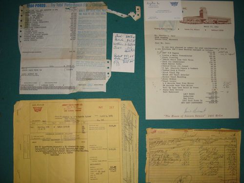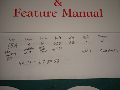 This car was ordered with 289-2V, 3 speed (green dot) Cruise-o-Matic trans, Black Vinyl Top, tinted glass, rocker panel mouldings, Power Steering, Air Cond., Power Brakes, 2 speed wipers, padded dash. Comes with Window Sticker and ALL paperwork from the dealer, manual, paint chip brochure, cards they figured different engines and options on, even a "lifetime guarantee" from the dealer. The car was from Kansas City, built and sold there. I got it with intentions of putting it back to original, but it just needs more than I'm capable of doing.