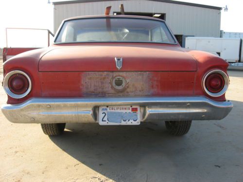 I am having to relist this car due to a hacked Ebay account that resulted in a non sale. I have for sale a 1963 ford falcon sprint.This car is a project car and does not run. The car does not have a motor or transmission installed. This car is one of about 10000 sprints made in 63. This car was orginally equipped with a 260 V-8 and a 2 speed automatic transmission. The body is very solid and for the most part rust free, the floor pans are solid and rust free aswell. The exterior is very straight with a few exceptions, the right side quarter panel does have a small patch panel that was not repaired correctly. The rear of the car in the gas cap area was hit and partially repaired but needs to be finished. The battery tray area has a patch panel covering it from the engine compartment, the battery tray is rusted out, please see the picture from under the right front fender that shows the backside of the battery tray. There is some small dings and dents on the body, normal for a 51 year old car. The interior is missing the both front seats and the rear seat along with the center console and carpet. I do have a new grill and windshield that come with the car. This is a very solid california car that can be a very nice car when finished. Please bid with confidence that you are getting a solid car.