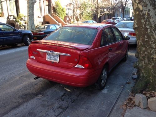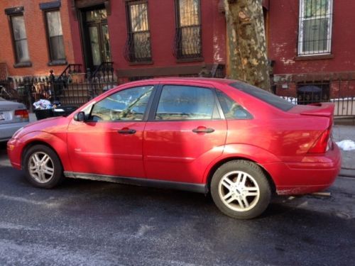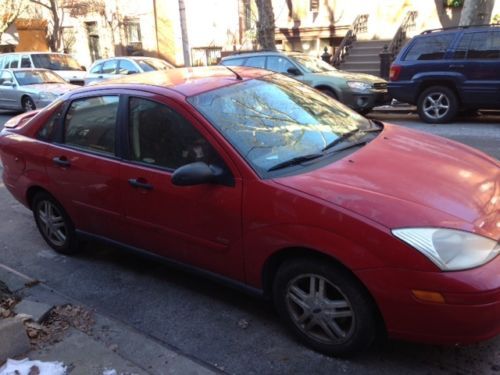 This listing is for a four door red 2000 Ford Focus. Mileage is at 90k. Has been maintained well. The starter was replaced last year so the ignition key is a little off (ie. the radio won't turn off if the key is too far forward) and sometimes there is a screeching noise for about 30 seconds. Two of the tires have recently been replaced (last two months) and there is some paint wear on the hood. Currently in Park Slope area of Brooklyn.