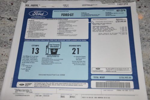 FEEL FREE TO HIRE AN INDEPENDENT INSPECTOR.IF YOUR INSPECTOR DOESN'T TELL YOU ZERO ISSUES, I WILL REFUND YOU HIS PRE-AGREED FEE, NO EXCEPTIONS.Here it is. Bought new and delivered on 10/5/05. Only dry micro fiber cloths have ever touched the paint. All paperwork, including original bill of sale comes with this 4 OPTION COLLECTORS CAR. 2005 Ford GT, VIN # 1FAFP90S35Y401374. Allow this memorandum to serve as representation that the below listed are true with respect to the above mentioned 2005 Ford GT:The vehicle is in perfect working condition,The vehicle has all 4 options from the factory,The vehicle has never been involved in any accidents,The vehicle is absolutely pristine in every way, inside and out.I have clear title to the 2005 Ford GT in my possession. Call me or text to 713 557 8085 with any questions or for more pictures or video. |