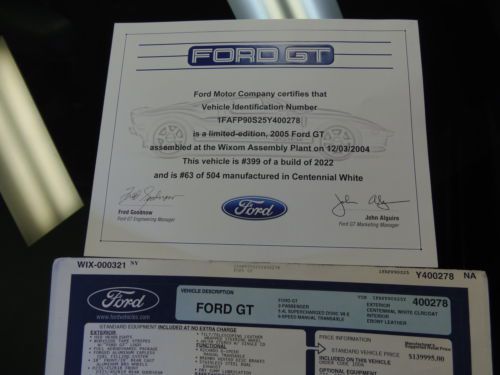 2005 FORD GT: ALL 4 OPTIONS: **LIGHT WEIGHT BBS WHEELS** **MCINTOSH STEREO** **TOP STRIPE** **GREY CALIPERS** VEHICLE DESCRIPTION: THIS IS A BEAUTIFUL EXAMPLE OF A COLLECTOR QUALITY FORD GT. SHE HAS HAD 2 PREVIOUS OWNERS THAT I PERSONALLY KNOW VERY WELL. BOTH OWNERS ARE VERY METICULOUS WHEN IT COMES TO THEIR CARS. SHE HAS ALWAYS BEEN STORED IN PERFECT CLIMATE CONTROL CONDITIONS. THE CAR COMES WITH EVERYTHING FROM NEW: WINDOW STICKER, CAR COVER, OWNER'S MANUALS, BOTH KEYS, CERTIFICATES ECT... AT DESNEUX MOTORSPORTS, WE HAVE HER PRICED TO SELL AT $264,988.00. THERE IS NOT A CHEAPER FORD GT OF HER EQUIVALENCE FOR SALE. BUY WITH CONFIDENCE!! PLEASE FEEL FREE TO CALL CHRIS AT 1-816-365-6010 OR EMAIL US AT CHRIS@DESNEUXMOTORPORTS.COM. FOLLOW US ON FACEBOOK AT WWW.FACEBOOK.COM/DESNEUXMOTORSPORTS NOTE: WE DO NOT CLAIM TO BE THE WORLD'S LARGEST FORD GT RETAILER!!! WE SIMPLY TRY TO SELL THE BEST FOR LESS. WE FOCUS ON HAVING OUR CUSTOMERS FOR LIFE NOT JUST ANOTHER CAR SELL FOR THE BOOKS. BEFORE YOU BUY OR SELL YOUR NEXT GT CALL US FIRST!!! YOUR TRADES ARE WELCOME.