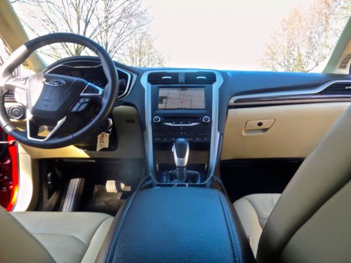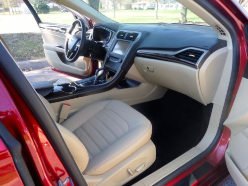 2014 FORD FUSION HYBRID , 4 DR SEDAN, 2.0L 1999CC 122Cu. In. l4 ELECTRIC/GAS DOHC Naturally Aspirated., 1,381 MILES ONLY.. FUEL INJECTED, AUTOMATIC FWD, RUBY RED Metallic with Cream Leather, SUNROOF, NAVIGATION, BACK UP CAMERA, INTERIOR: Cream Leather Interior WITH CONTRAST STITCHING IN EXCELLENT CONDITION. 10-WAY POWER DRIVER'S SEAT WITH MEMORY AND POWER LUMBAR. POWER PASSENGER SEAT. HEATED SEATS. DUAL CLIMATE CONTROL. SONY 12 SPEAKER SOUND SYSTEM WITH SATELLITE RADIO. MICROSOFT SYNC VOICE ACTIVATED COMMUNICATION & ENTERTAINMENT SYSTEM. REAR VIEW CAMERA. FORD MY TOUCH TECHNOLOGY. BLUETOOTH. POWER WINDOWS, LOCKS & CRUISE CONTROL. 60/40 FOLDING REAR SEATS. PUSH BUTTON START WITH INTELLIGENT KEY SYSTEM. STEERING WHEEL AUDIO CONTROLS. MANY OTHER FEATURES….POWER DRIVERS SEAT, HEATED SEAT, POWER SEAT MEMORY, AM/FM STEREO - CD, HOMELINK SYSTEM, SIRIUS SATELLITE RADIO, GAUGE CLUSTER, AIR CONDITIONING, CRUISE CONTROL, DUAL AIR BAGS, STEERING WHEEL CONTROLS, DUAL SPORT MIRRORS, DRIVER SIDE REMOTE MIRROR, RECLINING SEAT(S), LEATHER UPHOLSTERY, POWER SUNROOF, KEYLESS ENTRY, POWER STEERING, POWER BRAKES, POWER DOOR LOCKS, POWER WINDOWS,  17-inch aluminum wheels are on the Fusion …. COLOR KEYED BUMPERS, TRIP ODOMETER, TILT STEERING WHEEL, INTERVAL WIPERS, REAR DEFROSTER, REMOTE TRUNK LID, LEATHER WRAPPED STEERING WHEEL, CONSOLE, CARPETING, FRONT BUCKET SEATS, CENTER ARM REST, FOG LIGHTS, AND MUCH MORE.