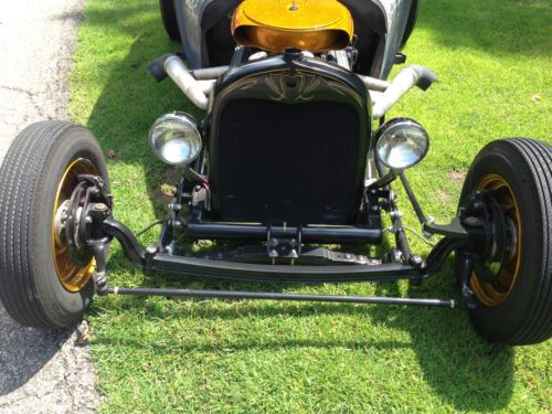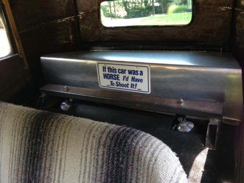 1929 Model A Ford Steel body, Chopped 41/2 inches channeled 3 inches, 56 ford station wagon roof insert has all newer glass windshield tilts out, door and quarter glass roll up and down. 2"x3" custom frame Z in the rear, Stockton steel wheels Coker wide white walls. Willwood front disc brakes drum in the rear. Pete and Jakes Dropped Axle with Posie spring wishbones, friction shocks. Flaming river steering box, speedway column gold metal flake steering wheel original dash and gauge cluster.new electric fuel, oil, temp and volt gauges. Working headlights and LED Taillights, lokar shifter, bomber style Bench seat. Steel floor coated with spray in bed liner, original grill shell, new aftermarket radiator, rebuilt SBC 358 cubic inch new pistons, thumper cam, lifters, and springs. Eldelbrock intake, Eldelbrock 650 carb, Corvette valve covers, Cadillac air clean, painted house of kolor Pegan Gold with flake, Lakester headers with baffles. Chrome water pump, and alternator,new 15 gallon fuel tank always runs cool, and very reliable. 350 turbo trans with oil cooler, 9" ford Rearend ladder bars with panhard bar, Rear Airride ShockWave setup with one compressor and tank.