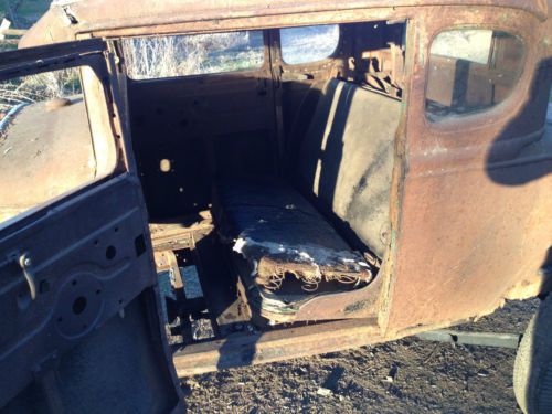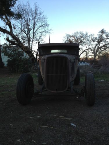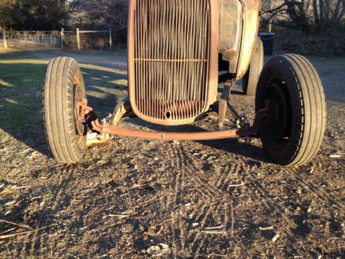 It has been chopped, including the windshield, back window and quarter windows, the garnish moldings were also chopped. It is on a Model A frame with a 4" step in the rear, stock rear crossmember, and stock front crossmember, but it has been trimmed to fit a V8. The original center crossmember is not in the frame. It has a really nice Model A rear axle, with a Model T spring, including the torque tube and radius rods. The gear ratio is 3:78. There are later brake drums and hubs but no backing plates or hardware. It has an Original Model A Ford front axle that was dropped about 4", with 1942-48 Ford spindles, that have been bent to mount the shortened tie rod. It has a 1928-32 reverse eye front spring, longer perches with lower shock mounts. There are later hydraulic brake drums, but no backing plates or hardware. The front axle is mounted with 1937-40 Ford wishbones that have been split and chromed long ago. The brackets where the wishbones mount to the frame are only tack welded, so final location can be determined by next owner. It has Ford 16" rims, with some old hot rod firestone tires. 750-16 rears and 550-16 fronts It has original 1950 Pontiac Tail lights. It has a three piece hood of unknown origin. I have been told it is a 1931 Chevy Truck hood, but I can't confirm that. It has a 1932 Ford 4 cylinder radiator. And a 1932 Ford pick-up grill shell. It has what appears to be a 1931 Chevy dash, with some vintage gauges made to fit, and some missing. I will include a 1948-52 Ford F1 truck crossmember and pedals, which will make mounting hydraulic brakes easier. The body does have some rust around the bottom, but comes with two patch panels for the rear quarter panels. It also comes with another back panel for below the deckled. There is a bench seat in the car, but I don't think it is stock, and it would probably need to be recovered. The sub rails were cut out from behind the seat to the back of the body, but the section that is there from the seat back to the fire wall it pretty good. Seat pan and frame are good. Looks like newer wood in the roof, the top was filled long ago with a sheet of galvanized sheet metal. Doors open and close nicely. There are no hinges on the deck lid, but there are rumble seat brackets on the body. I will include the hinges for the deck lid to be a rumble seat. It will take a fair amount of work to get this on the road, but if you want to build an old hot rod this is a very good start. If you put in a flat head V8, and 39 style transmission it would bolt right up to the rear axle, and bolt into the F1 crossmember I have included. I could even include Vern Tardel's book on How to Build a Traditional Hot Rod, if you want it? If you want a painted finished car, this will take a lot of work. But if you want a car that looks like it just got drug out of a field, this is it. Car is sold as is where is, no title, only bill of sale. I cannot find any vin numbers on the frame, there may be some on there, but I don't see them. Buyer is responsible for pick up or delivery by hauler of your choice, all cost to be paid by buyer. This car is also for sale locally, and if it sells locally, the auction will be cancelled, since the item will no longer be available. search words: Hot rod ratrod rat hotrod custom kustom 1926 1927 1928 1929 1930 1931 1932 1933 1934 1935 1936 chopper bobber roadster shitbox rust bucket flathead flat head sedan pick up 39 transmission |