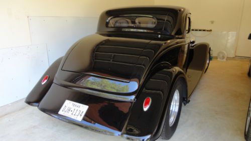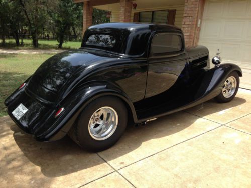 1934 Ford coupe this is a gibbons glass body with a custom chassis works chassis. it has a stock 302 with a C4 transmission, for 9' rear end narrowed and tubbed 4 link with adjustable coil overs, brand new Mickey Thompson flame tread tires all around. disc brakes on front drum on rear. power windows, vintage air A/C currently not working the condenser had a pin hole so I removed it and had it repaired I have not reinstalled the condenser. everything on this car is brand new beautiful black paint with blue and violet flames, custom velour interior and headliner, seats are out of a 2007 corvette tan leather. This is a true street rod and fun to drive it is a daily driver and built as such. No big racing cam or extreme parts on the engine. It does have a tunnel ram with two 450 holly's Ford motorsport valve covers and all the billet dress up kit on the motor. new exhaust with bullet mufflers. CD changer and Stereo with cassette in dash. all new glass the body lines are perfect and everything is lined up well. Rack steering up front. This car is registered in Texas with a clear blue title as a 1934 ford not a kit car, This is truly a show winning car I have added pictures at shows has won first everywhere I have taken it. This car is well built not afraid to drive anywhere. I have set a reasonable reserve on this car. A lot of time and money went into making this car as straight and dependable as possible no disappointment's here. Happy Bidding