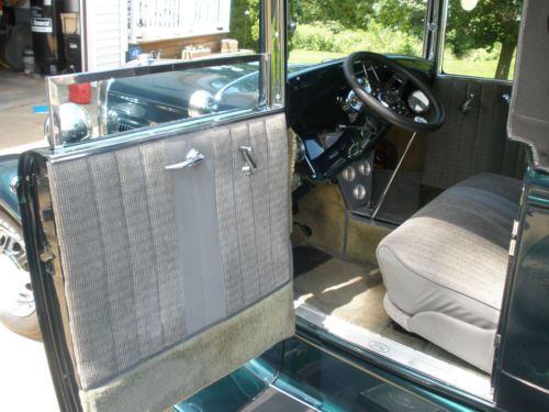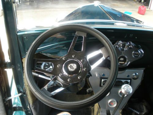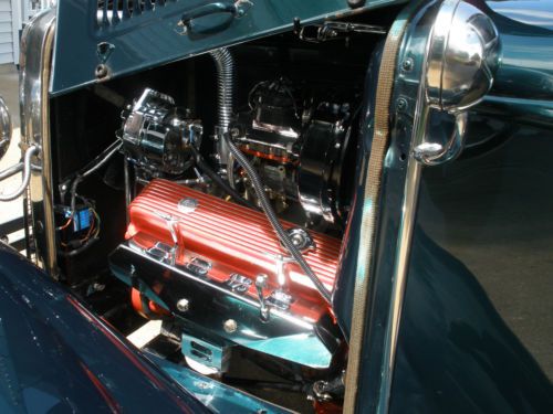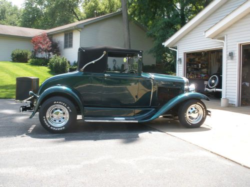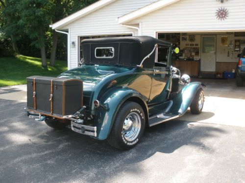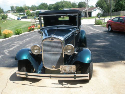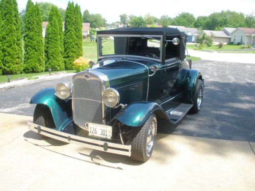 1930 Ford Model A Cabriolet street rod, all steel. Boxed frame,dropped front axle w/ power disc brakes, GM 10 bolt rearend w/drum brakes. Powered by a 350 Chevy engine, Edelbrock carb, Mallory Unilite dist. Turbo 400 trans, tilt column, Vega gearbox, stereo w/ cd player, elec. wiper. Tires are P195/70-14 front, P235/70-15 rears on chrome American Racing wheels. Stainless exhaust system. Newer working black canvas top, w/ boot. Includes front bra and fitted car cover. Nice grey tweed interior. Same owner since 2001. Car was built in the 90's and has been driven 16,155 miles. Body color is a dark metallic green and paint is VERY nice and body is very straight. Has only a very few paint chips as it was painted many years ago. Drives very well. I am listing this car for a friend and you may call him anytime with your questions. His name is Kermit @ 815-980-1726. Winning bidder to pay a non-refundable deposit to paypal of $500.00. Balance due in CASH when picked up. The owner is not looking for a trade, only selling. Thank you for looking