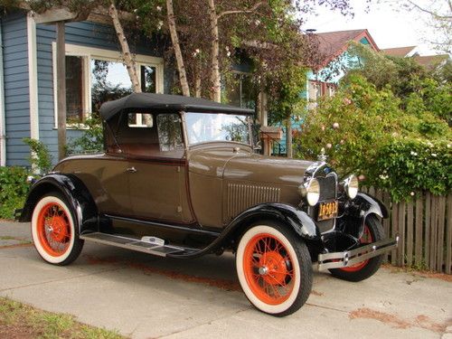 You are bidding on a 1929 Ford Model A Standard Roadster we have owned since 2008. It was a barn find, restored from 1976 to 1978. We have all the receipts,over $20,000.00 worth and photos including the car in front of the barn. It is a VERY correct restoration. The tires are 5 years old and it has a new correct battery and LeBaron Bonney interior. It is registered with the correct license plates and comes with the tools. It was awarded best Vintage at The Pacific Grove Concours Rally in 2008, and class winner at car shows in 2009, 2011 and 2013. We had also been accepted and shown at the Marin, Palo Alto and Hillsborough Concours D'Elegances. It is in perfect mechanical shape and needs nothing. The Speedometer was broken and has been rebuilt with a new cable, so I don't know the true milage. The paint is chipped on the hood and left front fender. There is a crack and chip in the paint on the right rear fender. There is a chip in both doors near the handle and some around the opening to the rumble seat. There is a crack in the lower left corner of the windshield and some cracks in the road wheel hubs. These are all minor signs of wear and tear. The windshield wiper is sluggish. We do not have any of the side curtinsYou won't be afraid to drive her around or have your Granchildren enjoy riding in her. The car does come with some spare parts, shop manual and an 8 volume set of How to Restore your Model A. If you have any questions don't hesitate to call or e-mail. My cell is 510-414-4953, my name is Ken, e-mail gogiantks@aol.com